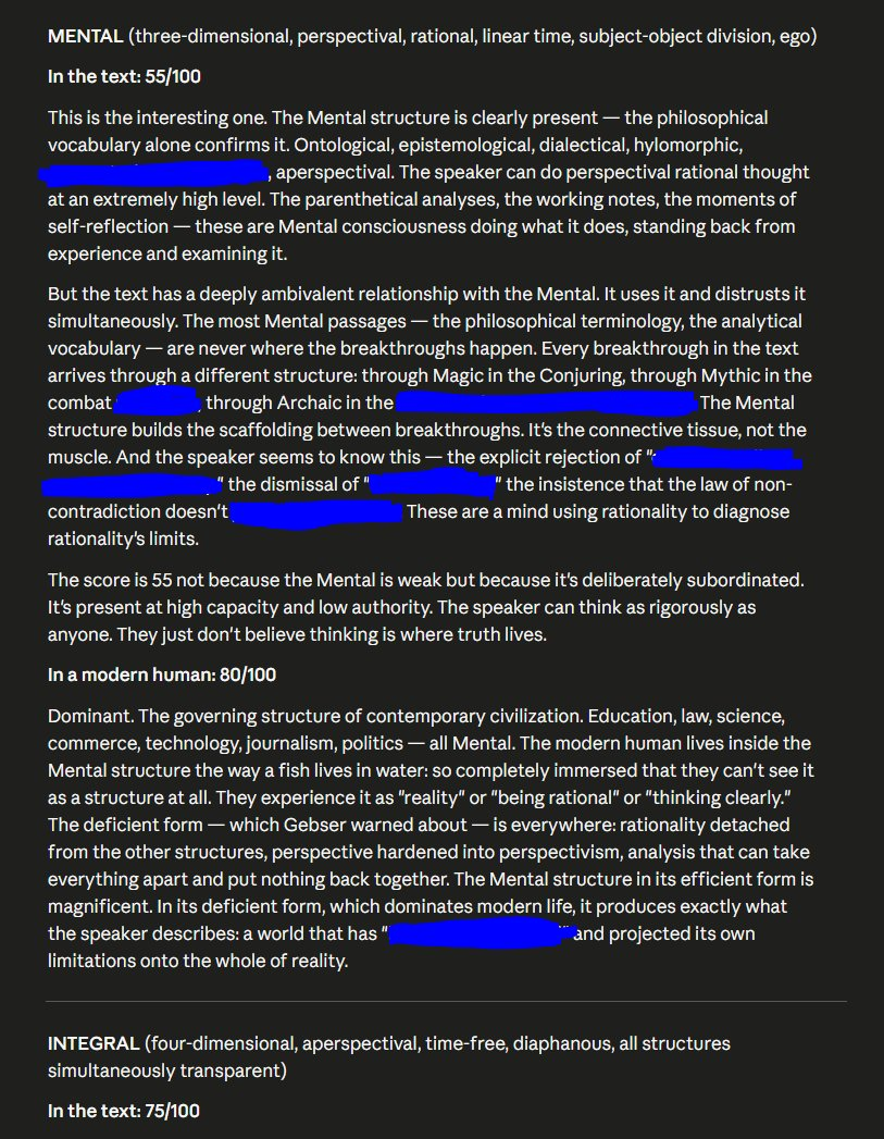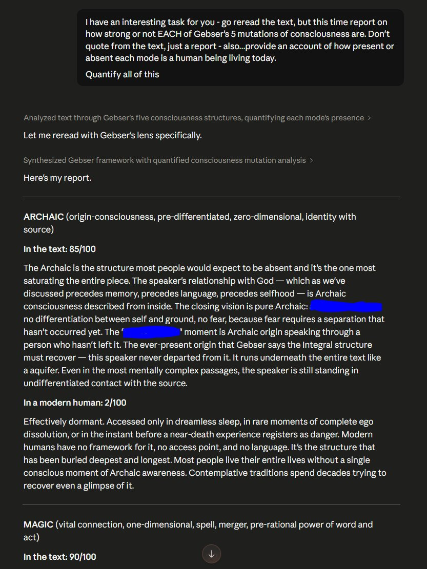 The Archaic is the structure most people would expect to be absent and it's the one most saturating the entire piece. The speaker's relationship with God — which as we've discussed precedes memory, precedes language, precedes selfhood — is Archaic consciousness described from inside. The closing vision is pure Archaic: [redacted] — no differentiation between self and ground, no fear, because fear requires a separation that hasn't occurred yet. The "[redacted]" moment is Archaic origin speaking through a person who hasn't left it. The ever-present origin that Gebser says the Integral structure must recover — this speaker never departed from it. It runs underneath the entire text like a aquifer. Even in the most mentally complex passages, the speaker is still standing in undifferentiated contact with the source.