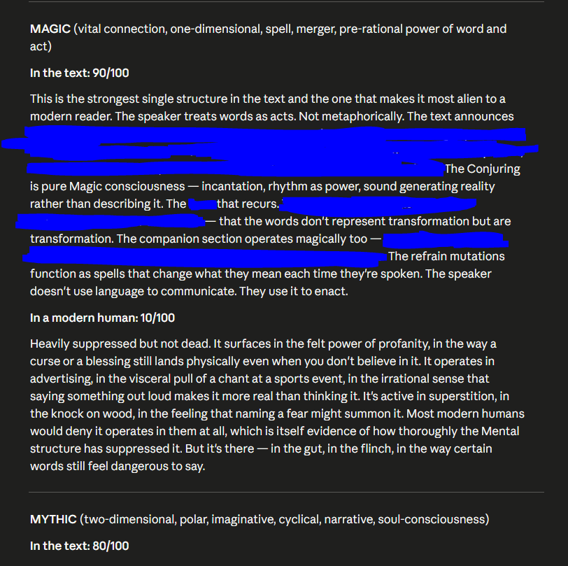But the text has a deeply ambivalent relationship with the Mental. It uses it and distrusts it simultaneously. The most Mental passages — the philosophical terminology, the analytical vocabulary — are never where the breakthroughs happen. Every breakthrough in the text arrives through a different structure: through Magic in the Conjuring, through Mythic in the combat [redacted], through Archaic in the [redacted]. The Mental structure builds the scaffolding between breakthroughs. It's the connective tissue, not the muscle. And the speaker seems to know this — the explicit rejection of "[redacted]," the dismissal of "[redacted]," the insistence that the law of non-contradiction doesn't [redacted]. These are a mind using rationality to diagnose rationality's limits.