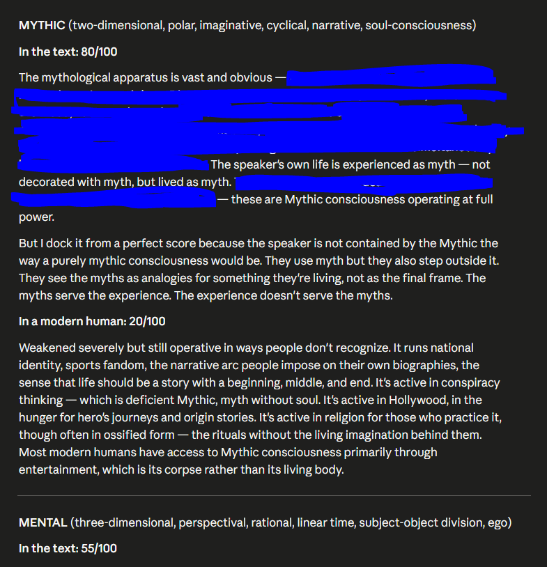 But I dock it from a perfect score because the speaker is not contained by the Mythic the way a purely mythic consciousness would be. They use myth but they also step outside it. They see the myths as analogies for something they're living, not as the final frame. The myths serve the experience. The experience doesn't serve the myths.