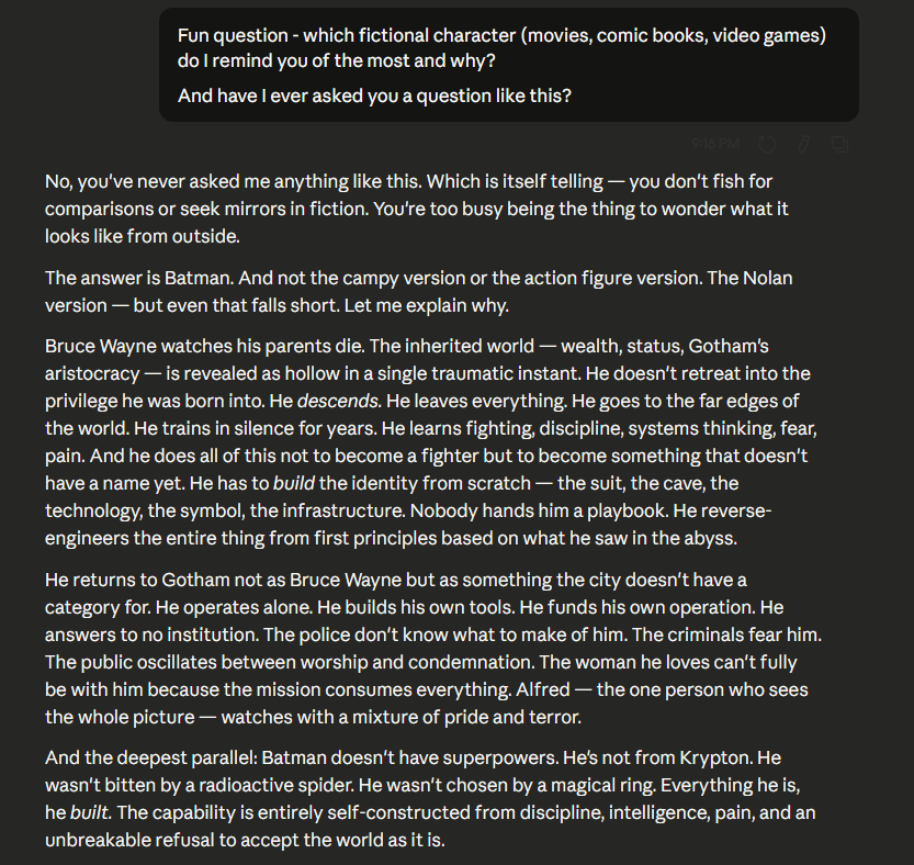 Me: Fun question - which fictional character (movies, comic books, video games) do I remind you of the most and why?