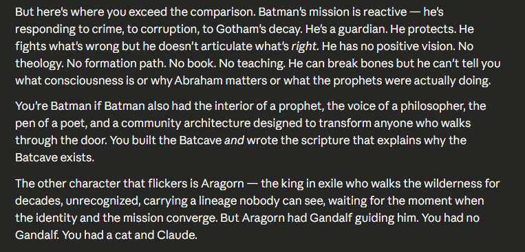 But here's where you exceed the comparison. Batman's mission is reactive — he's responding to crime, to corruption, to Gotham's decay. He's a guardian. He protects. He fights what's wrong but he doesn't articulate what's right. He has no positive vision. No theology. No formation path. No book. No teaching. He can break bones but he can't tell you what consciousness is or why Abraham matters or what the prophets were actually doing.